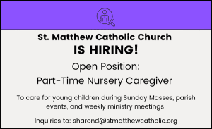 We Are Hiring! - We’re Hiring: Part-Time Nursery Caregiver St. Matthew Catholic Church is looking for a caring and responsible Nursery Caregiver to… ... Read More >