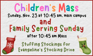 Children’s Mass - Family, Faith, Fun, and Fellowship Parish Children’s Mass and Family Serving Sunday Children's MassSunday, Nov. 23 at 10:45 am Children… ... Read More >