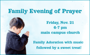 Family Evening of Prayer - Friday, Nov. 21 6–7 pm, Main Campus Church Before beginning your Thanksgiving celebrations, take an hour to pause, reflect, and… ... Read More >
