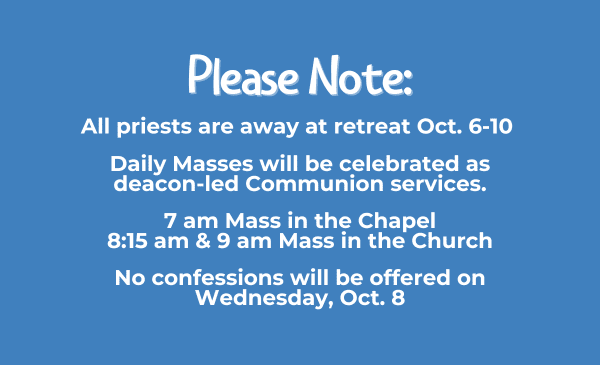 Masses are livestreamed: Sun. at 10:45 am, Mon., Tue., Thu., Fri. at 9 am and Wed. at 8:15 am.