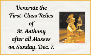 First-Class Relics of St. Anthony - Come venerate the First-Class Relics of St. Anthony after all Masses on Dec. 7. The relics will be placed in… ... Read More >