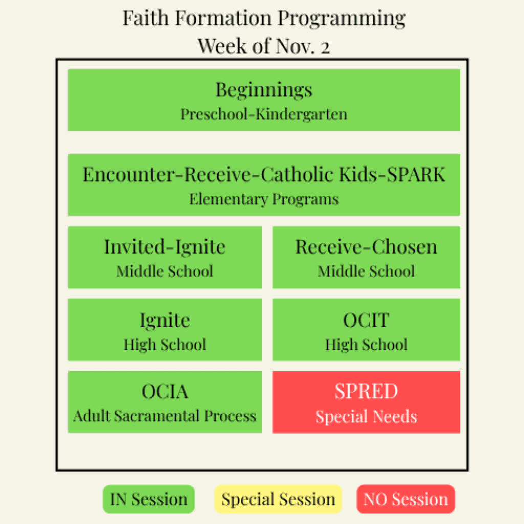 Faith Formation is guiding individuals to discover God the Father through Scripture and Church teachings; to encounter God the Son through the grace of the Sacraments; to journey with God the Holy Spirit in community and through the corporal and spiritual works of mercy.
