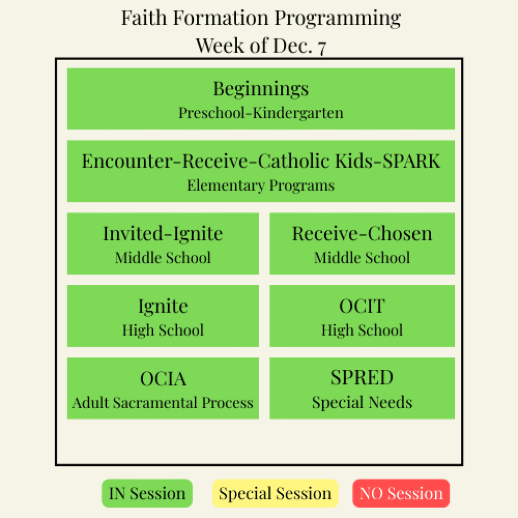 Faith Formation is guiding individuals to discover God the Father through Scripture and Church teachings; to encounter God the Son through the grace of the Sacraments; to journey with God the Holy Spirit in community and through the corporal and spiritual works of mercy.