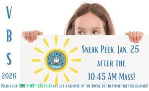 VBS 2026! - Join us in the Parish Center Gym for our Sneak Peek on Sunday, Jan. 25 following the 10:45 Children's Mass.… ... Read More >Upcoming Events
